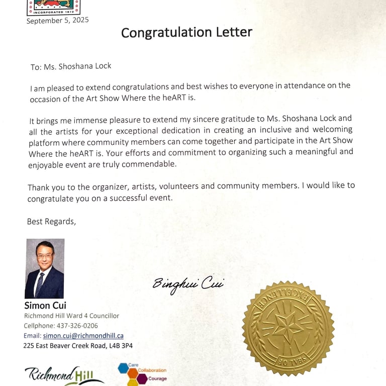 The art show and sale was not only about appreciating art; it was also about joining a community of art lovers and creators. The event provided the perfect opportunity to connect with like-minded individuals, share a passion for art and even form lasting friendships. The relaxed, casual vibe of the venue encouraged everyone to mingle, creating an inclusive environment where creativity thrived. We were also pleased to see Simon Cui, Richmond Hill Ward 4 Councillor who joined us for the occasion.